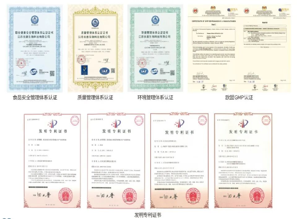 公司通过了食品安全管理体系认证、质量管理体系认证,环境管理体系认证和保健食品GMP认证,以符合药品生产要求的十万级洁净厂房管食品安全管理体系理标准来生产健康食品。同时还获得了相应的发明专利证书。