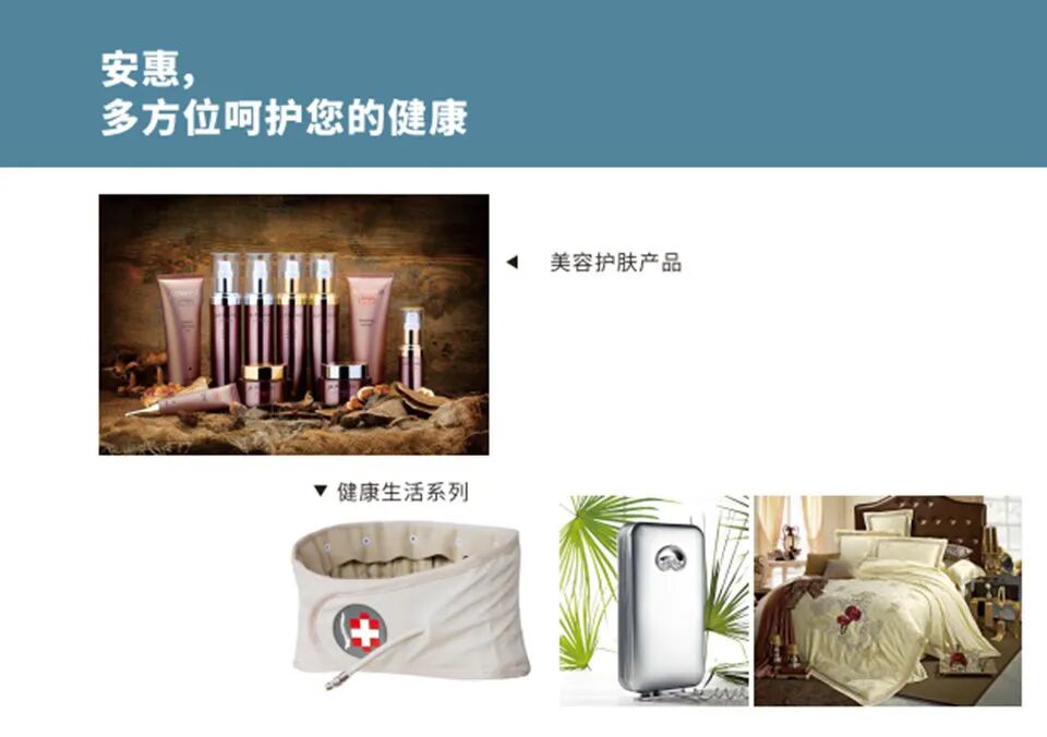安惠正在打造独具魅力的国际化健康生态圈,致力于满足消费者需求,传递健康的思想,呼吸健康的空气,吃健康的食品,喝健康的水,用健康的产品,从根本上真正解决健康的问题。