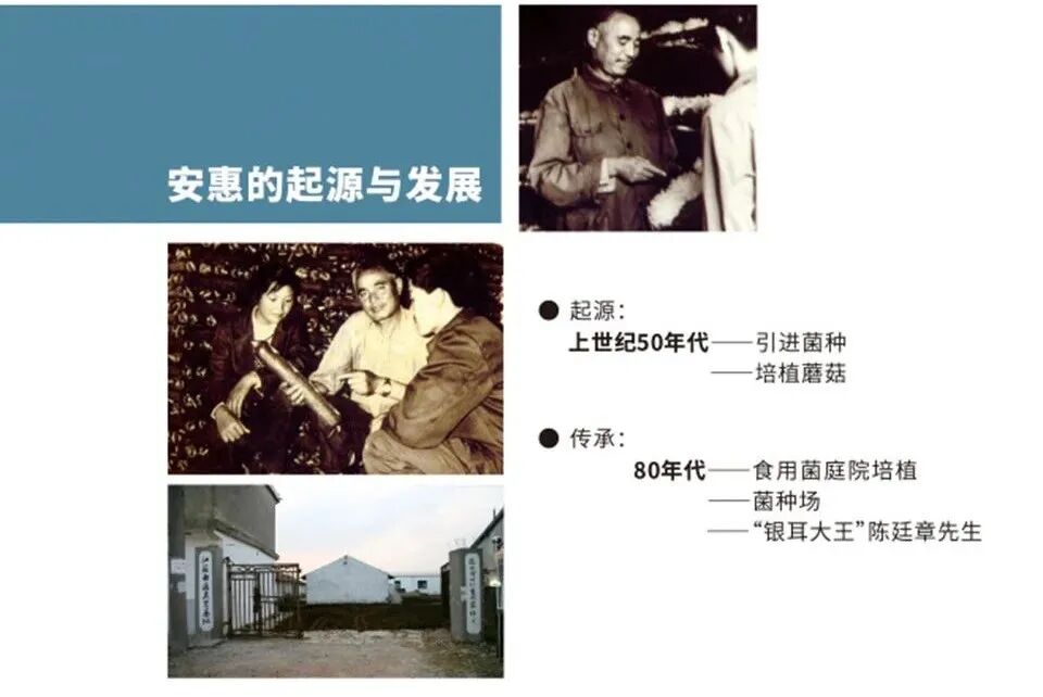 谈到安惠的起源,要从上世纪50年代末开始。1959年,陈惠董事长的父亲——陈廷章先生在南通对食药用菌的认识还很模糊的时候,率先试水,从科研机构引进菌种,发展庭院经济。后来他专攻银耳培植,改革开放之初,成为南通当地家喻户晓的“银耳大王”。
