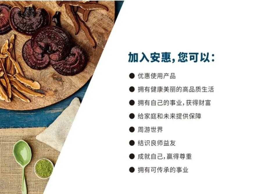 加入安惠,您可以优惠使用产品;为自己带来更健康美丽,高品质的生活;您拥有一份可以永续经营的事业,随着越来越多人使用产品、经营安惠,获得源源不断的收入;可以为我们的家人和未来提供更好的保障;安惠是一份快乐的事业,每年我们都可以出国旅行,赏一路美景、尝一路美食、交一路朋友、学一路知识;您可以结识很多良师益友,他们的经历和成就会给我们带来提升和改变,收获尊重,体现人生价值,实现人生梦想;我们一起努力,总有一天会实现财务自由,能够自己掌控时间,更多时间陪伴家人,享受生活,在安惠事业里,我们可以帮助更多的人成功,收获幸福,心灵也更加富足;安惠事业是可以传承的事业,可以成为家族事业,就像陈董说的:安惠事业是我的,是您的,最重要的是全人类的。