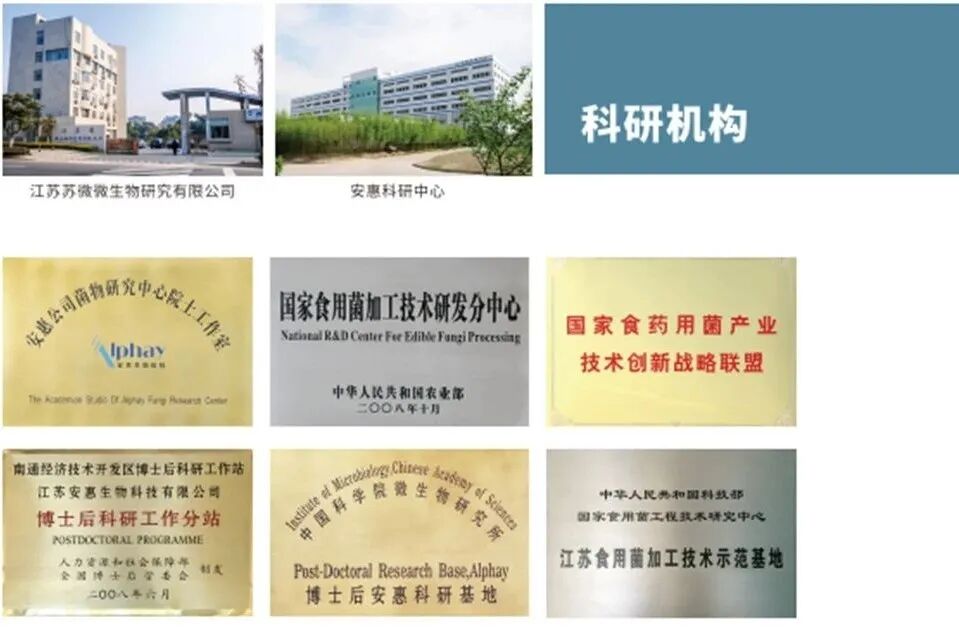 安惠建立完善的产、学、研科学研发体系,先后与中科院微生物研究所、上海农科院、上海交通大学等著名高校和科研院所建立了紧密的合作关系,在产品研发中探寻至善的人文关怀。菌物研究中心院士工作室、国家食用菌加工技术研发分中心、国家食药用菌产业技术创新战略联盟、博士后安惠科研基地、中国科学院微生物研究所博士后安惠科研基地纷纷落户安惠,安惠还荣获科江苏食用菌加工技术示范基地。