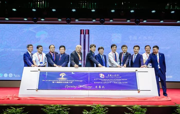 全国人大常委、中国工程院副院长、中国科协副主席邓秀新院士,国际药用菌学会主席、中国工程院李玉院士,国际药用菌学会名誉主席、《国际药用菌》杂志主编Solomon P. Wasser教授,中国科学院院士、中国疾病预防控制中心主任高福院士,第十届全国政协委员、中国食用菌协会会长顾国新,长春市政协副主席、吉林大学张红星教授,吉林农业大学副校长张越杰教授,中国菌物学会理事长郭良栋研究员,江苏省农业农村厅总农艺师唐明珍,国际药用菌学会执行主席、江苏安惠生物科技有限公司董事长陈惠等,一起按下大会启动按钮,第十届国际药用菌大会正式开幕。