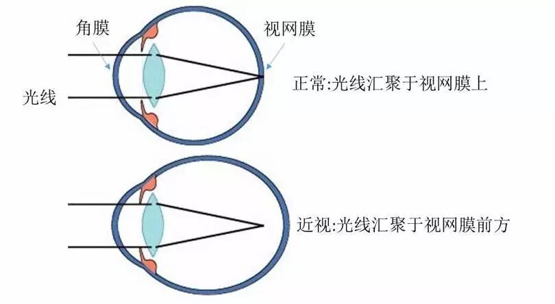 近视者的眼球会稍稍伸长,晶状体会将远处物体的像会聚到视网膜之前,而不是视网膜之上。
