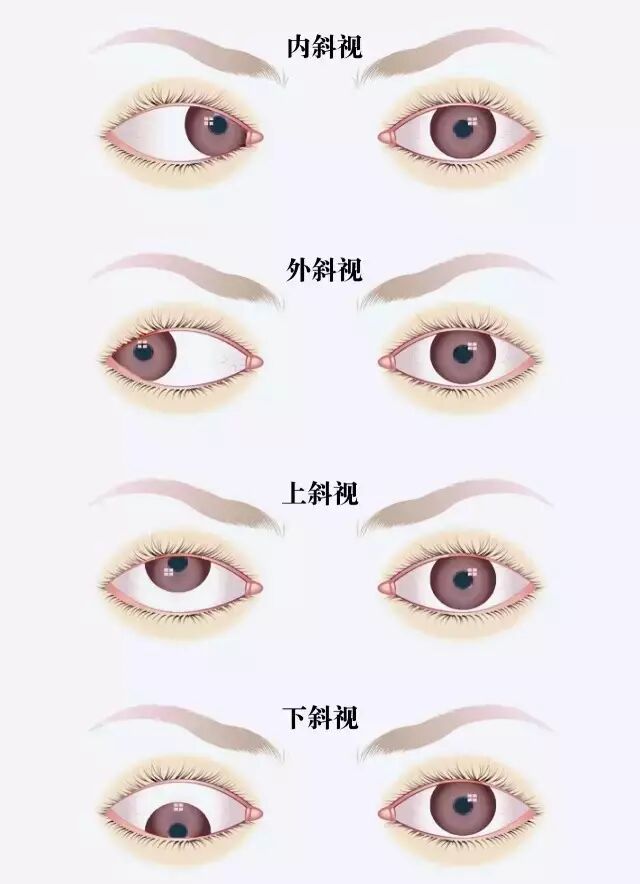 根据眼位偏斜方向的不同,它被分成四个类型:内斜视、外斜视、上斜视、下斜视。