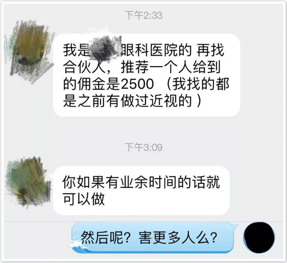 激光近视手术是一个暴利产业,在利益的驱使下,必然会有诱人的市场宣传来煽动你“摘掉眼镜”!甚至给出高额推荐佣金,用熟人带量。