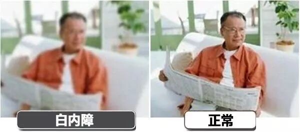 白内障患者在视觉上存在严重限制,无论是空间上的近距离(如阅读)或远距离(如观看电视)。根据白内障的阶段,症状可能会有不同程度的表现,典型症状是色觉异常、对比度下降,黄昏或者在光线不好时视线不清晰,出现眩光,适应明暗的能力下降。
