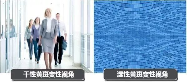 湿性黄斑变性是由干性导致的,典型症状是直线(例如:框架或瓷砖凹槽)视野受限,看起来是弯曲的。湿性黄斑变性虽然比较罕见,但其发展速度要快得多,首先在远距和近距视觉上造成严重的限制,并最终导致不可逆转的视力丧失。
