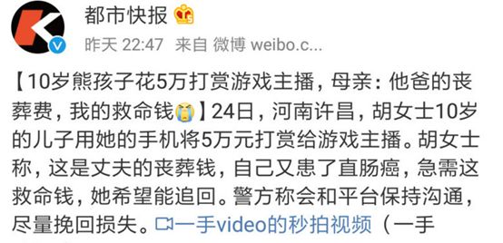 2018年4月,新闻“10岁熊孩子花5万打赏游戏主播”引起广泛关注,孩子的母亲说,这5万块是他爸的丧葬费,自己的救命钱。