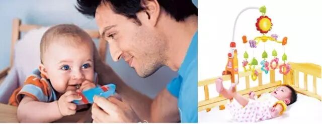 在小宝宝床头挂玩具或拿玩具逗宝宝,不要离宝宝眼睛太近,要挂在围栏的周围,并经常更换玩具的位置和方向。