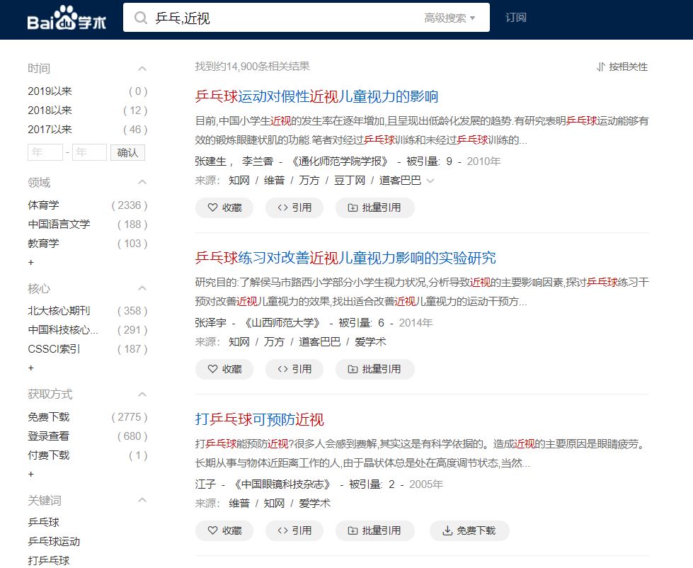 在中文数据库中,以“乒乓球”和“近视”为关键词搜索,确实能搜索出一堆文章。但是,大家注意看,没有一篇标题是带“治疗”二字的,出现最多的往往是“预防近视”“保护视力”的字眼。