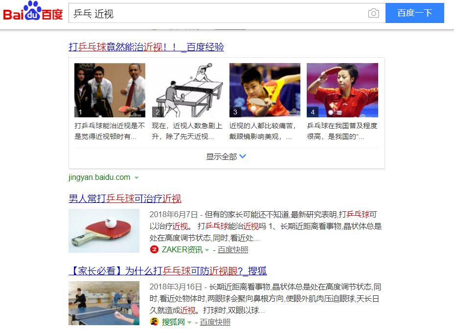 不知何时起,这俩国字号名词被联系到了一起。通过百度的搜索结果不难发现,打乒乓球能治疗近视在民间有很高的认可度。许多家长像找到救命稻草一般,纷纷让孩子去学习乒乓球。
