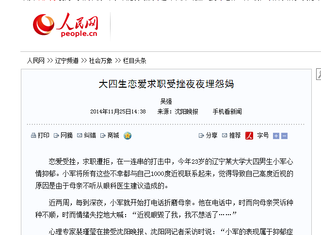 心理专家在记者采访时说:“小军的表现属于抑郁症中的外攻击表现。小军因高度近视导致自卑,既有他个性方面的原因,也确实有母亲在教育中疏忽的原因。家庭教育是一个系统过程,孩子的心理问题具有滞后性,所以家庭教育需有前瞻性。”