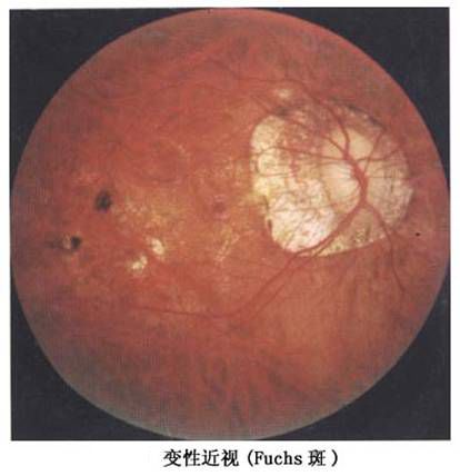 Fuchs斑(Fuchs’s spot)亦为变性近视眼特征性表现,检查可见黄斑区呈轻微隆起的圆形、椭圆形或形状不规则的暗斑。色灰黑或灰绿,位于中心凹或其附近,约为1/3~3/4视盘大小。