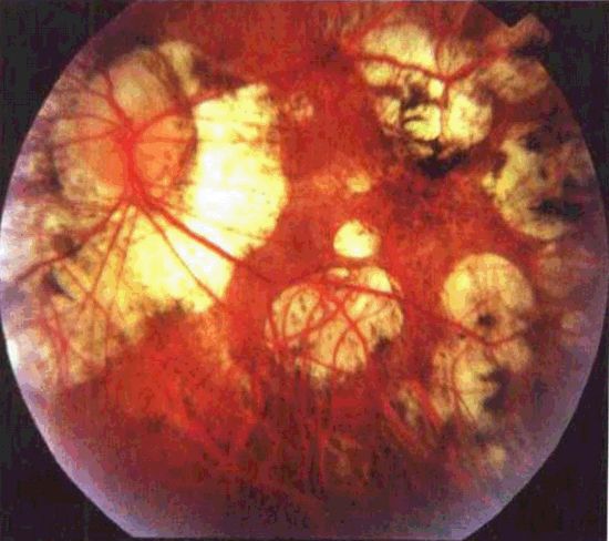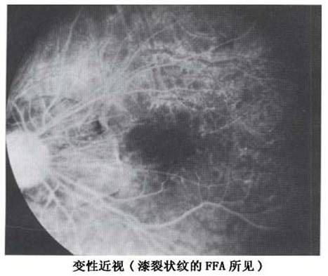 漆裂纹眼底可见不规则的黄白色条纹,如同旧漆器上的裂纹,为玻璃膜出现的网状或枝状裂隙,亦称玻璃膜裂纹。少有直接损害视功能情况,但可引起视物变形及相对旁中心暗点,并可诱发视网膜下血管新生及黄斑出血,是视力进一步受损的先兆。