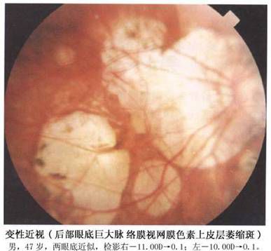 由于眼球向后伸长,视网膜血管离开视盘后即变直变细。同时由于色素上皮层营养障碍,浅层色素消失,脉络膜橘红色大血管暴露明显,由此而呈现的眼底被称之为豹纹状。其出现率高达80%,而当眼轴明显延长、屈光度更高时,出现率可超过90%。