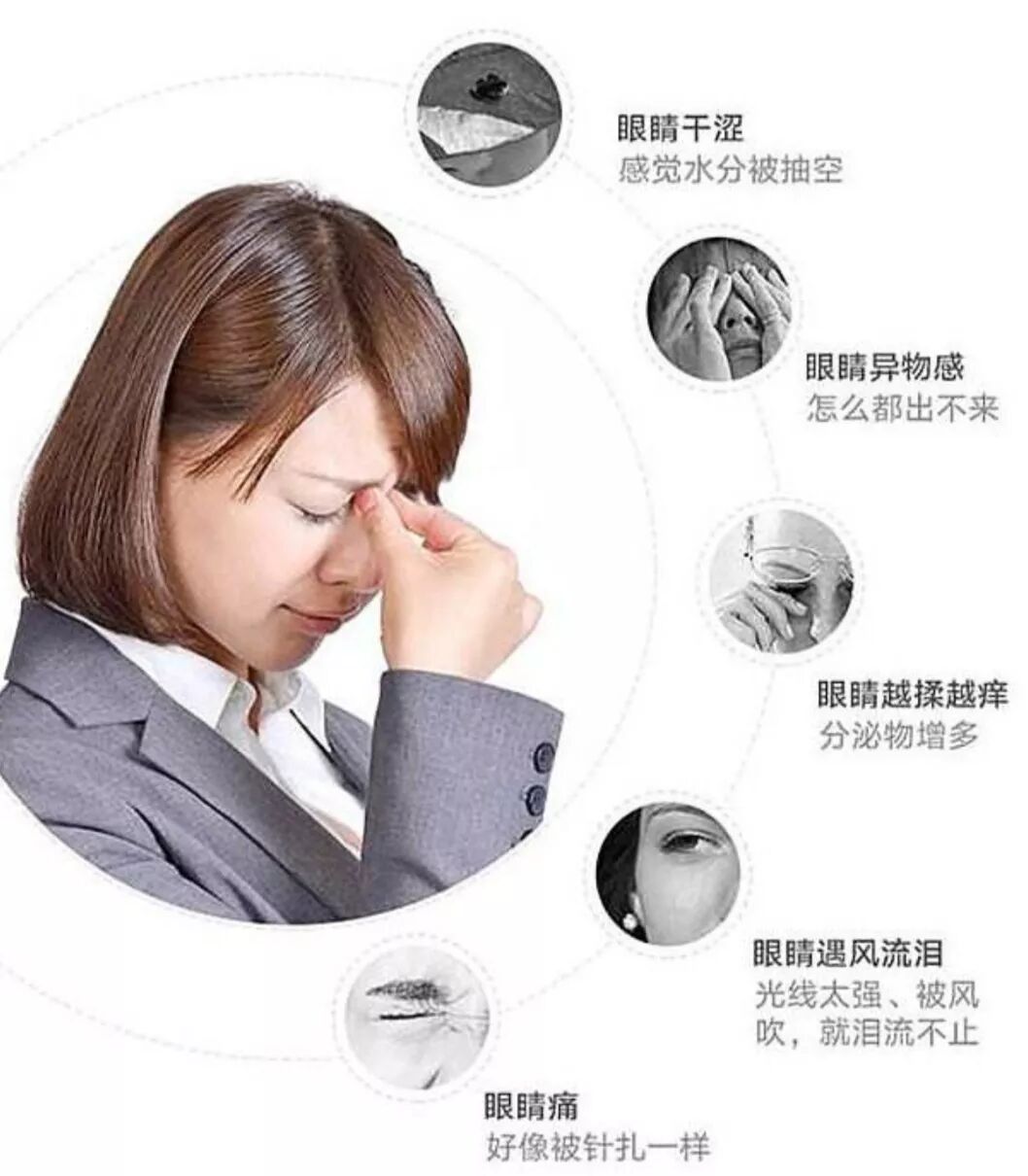 症状可表现为眼干、流泪、畏光、烧灼感、痒感、异物感、视力波动等。此外有调查发现71.3%的干眼患者有视疲劳的症状,视疲劳也是干眼常见的症状之一。