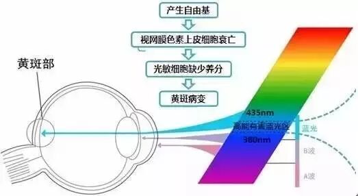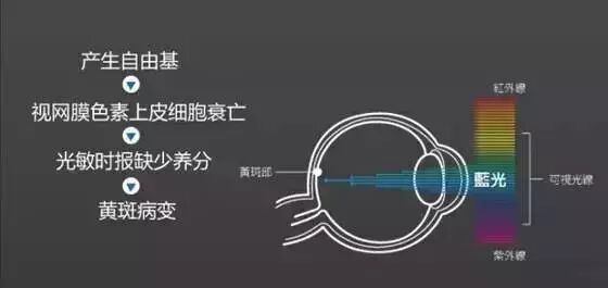 美国弗吉尼亚大学临床眼科专家李俊平表示,高能蓝光的损害是一个连锁反应,先引起光敏感细胞死亡,再引起视网膜黄斑病变,继而导致视力逐渐下降,然后完全失明。