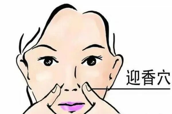 以左右手的中指或食指点按迎香穴(在鼻翼旁的鼻唇沟凹陷处)若干次。因为在迎香穴处有面部动、静脉及眶下动、静脉的分支,是面部神经和眼眶下神经的吻合处。