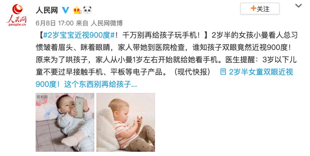 一条是关于「宝宝被查出近视 900 度」的新闻,据新闻报道,一个 2 岁多的宝宝因为「玩手机」造成近视。