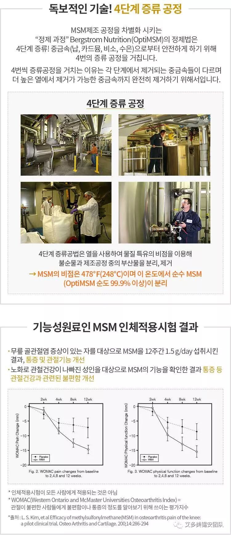 什么是MSM? Methyl-sulfonyl-methane(MSM)是海洋中衍生的天然有机硫同化物。硫在机体体的矿物质含量中排第9位 ,有机硫最大的用途之一是它能够缓解由关节炎引起的疼痛 。每个动物和植物的各个细胞均含硫 ,其中蛋和红辣椒中含量最丰富 ,谷类、豆类、动物蛋白、蒜、芦笋、卷心菜、芽甘蓝 和绿花椰菜中也含大量硫 ,但现代食品加工,包装和制作已将食物中所需要的硫消耗掉。