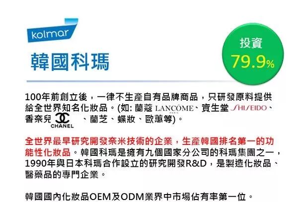 其中韩国科玛是全球排名第一专门代工化妆品的企业,大家所熟悉的高端品牌兰蔻,雅诗兰黛,资生堂,爱茉莉,强生等都是由韩国科玛代加工,同时科玛在中国有分公司,如北京的科玛分公司为珀莱雅做代加工。