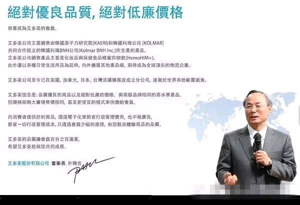 艾多美在韩国是一家以团购为概念的美妆生活百货领导品牌直销公司,「艾多美」的特色是不必重复消费,却可以有持续的收入,免费加入会员后,不限时间,只要有消费就可以取得终身分红的条件,艾多美根本就不会要您去销售产品,您只要透过简单的介绍,分享给两个人就好(最高也只能两位),这点就不像一般传直销一直要您找人、消费的模式了。
