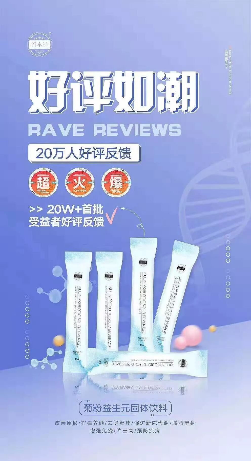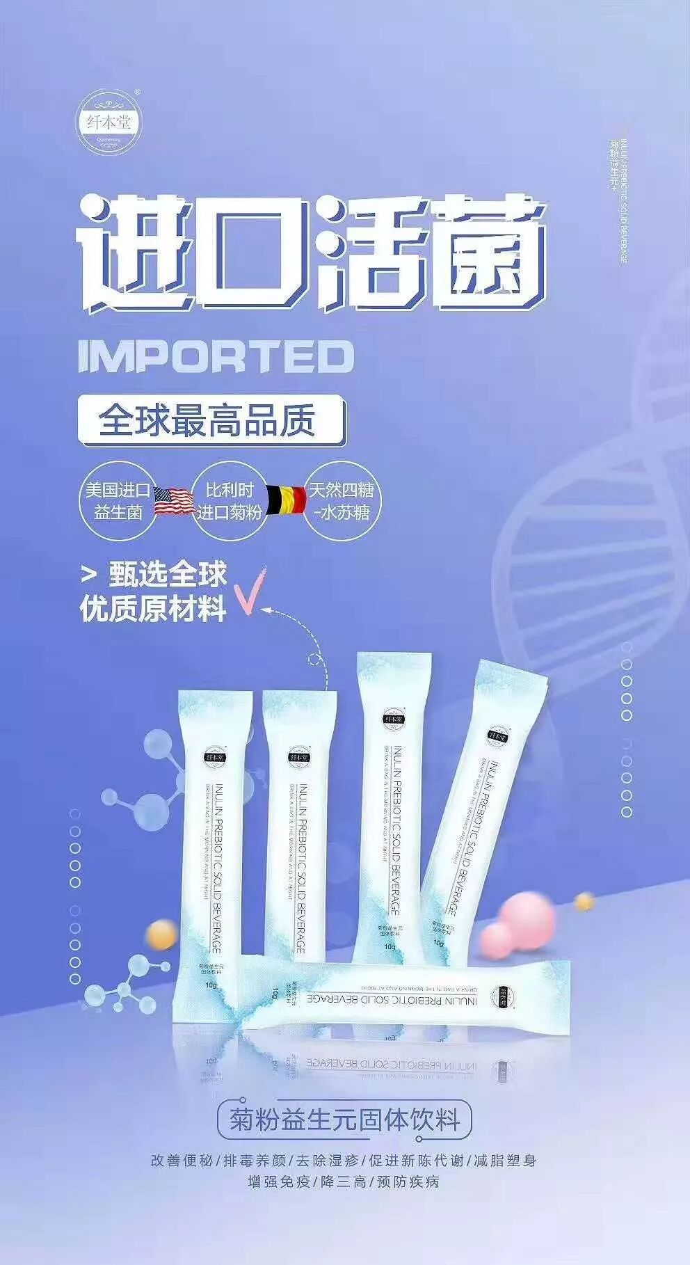 纤本堂菊粉来源于世界上最大的菊粉膳食纤维与低聚糖,低聚果糖生产厂家之一(Cosucra),安全健康,多种临床试验证实纤本堂菊粉能够增殖益生菌,有效调节肠道微生态平衡,多方面改善肠道健康,降低血脂、血糖,改善宿主代谢综合症的症状,对人体健康有着积极的作用。