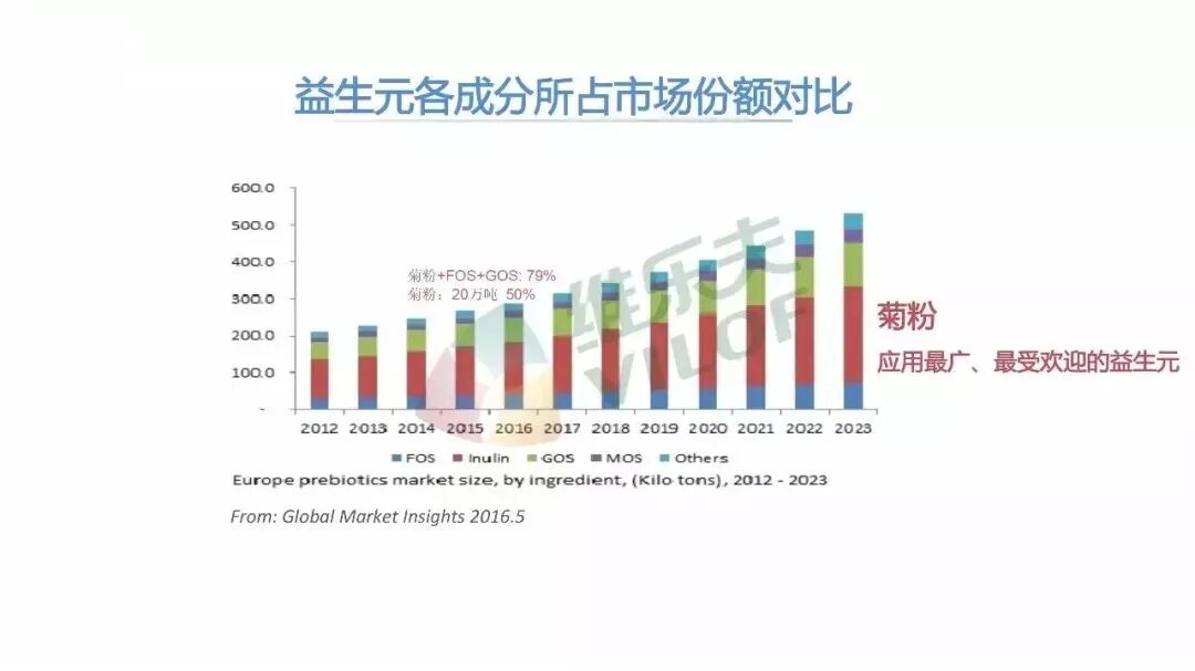 目前,益生元已被广泛运用到医疗、食物饮料等行业。2015年,菊粉、低聚果糖和低聚半乳糖三种益生元销售量超过益生元总量的79%。其中,预计到2023年菊粉销售额将超过32亿美元。