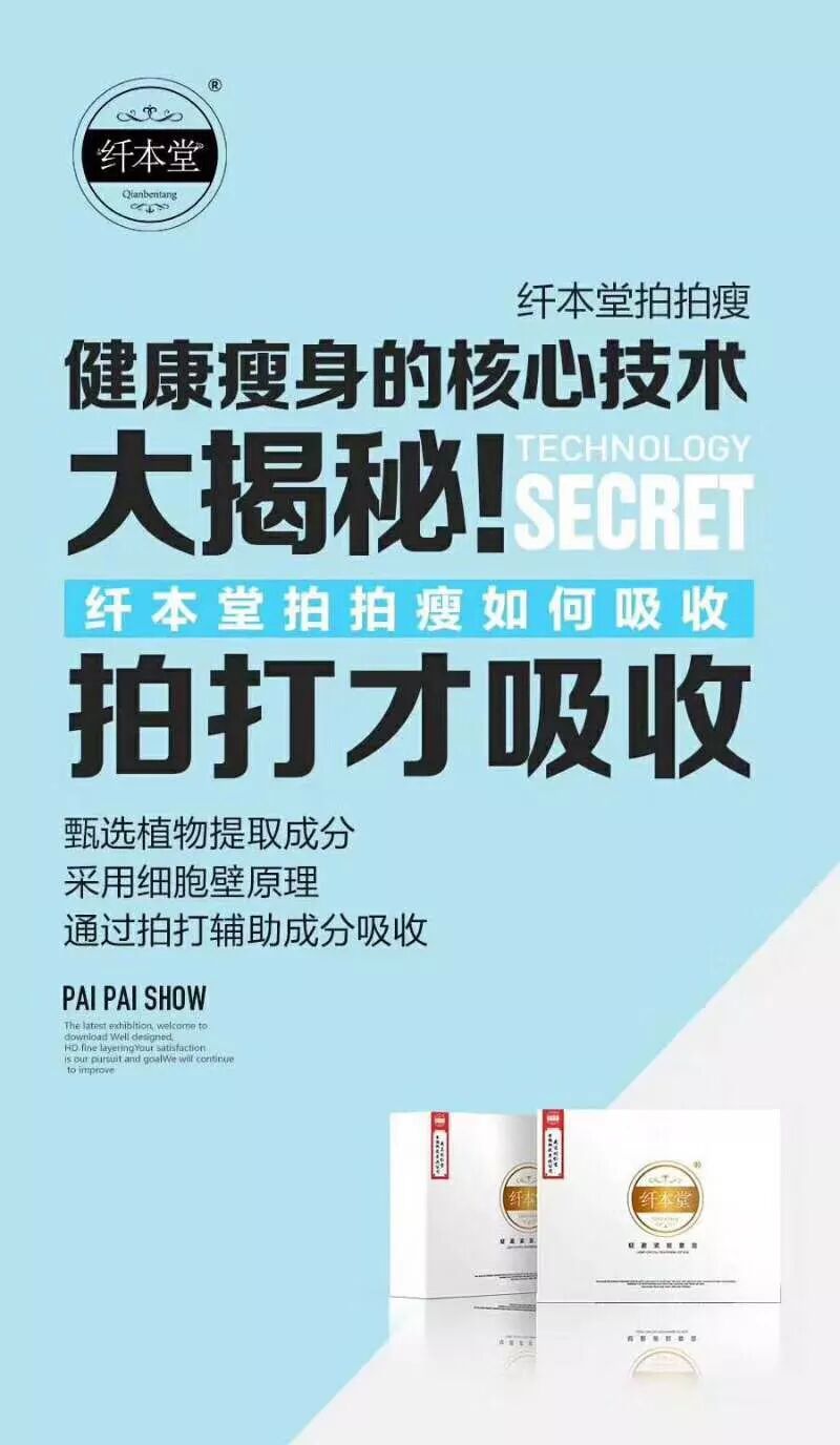 纤本堂拍拍瘦哪胖拍哪,不用节食三餐饮食没有任何约束!它首要调理脾胃功用,排湿,排寒~促进推陈出新功用~调整内分泌~疏通经络~快速水解脂肪 从根本上解决了肥壮的问题:不口服,不运动,不按摩,健康减肥,不反弹‼