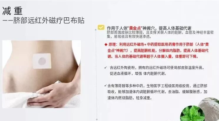 原理 :利用远红外磁场+ 中药提取医用药膏作用于脐部(人体“黄金点”神阙穴),提高脏腑机能,分解体内脂肪,提高人体基础代谢。当人体的基础代谢率超于人体摄入量,体重即可下降 含远红外陶瓷粉,拥有的远红外磁场可使局部皮肤温度升高,促进血液循环,增强 体内脏腑代谢。含有薄荷醇等多种中药,生物医学工程级医用级胶膏,通过脐部吸收,能够加速体内调脏腑循环代谢,去油脂、缓解腹胀感,加速体内燃烧脂肪,轻身减重。