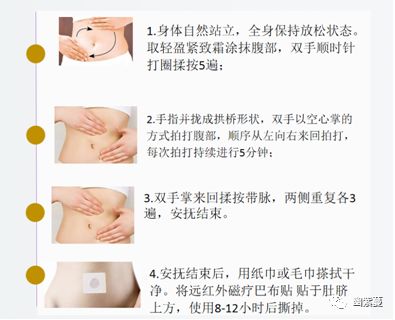 第二遍:手指并拢成拱形,双手以空心掌的方式拍打腹部,顺序从左往右来回拍打,每次拍打时间持续5分钟;