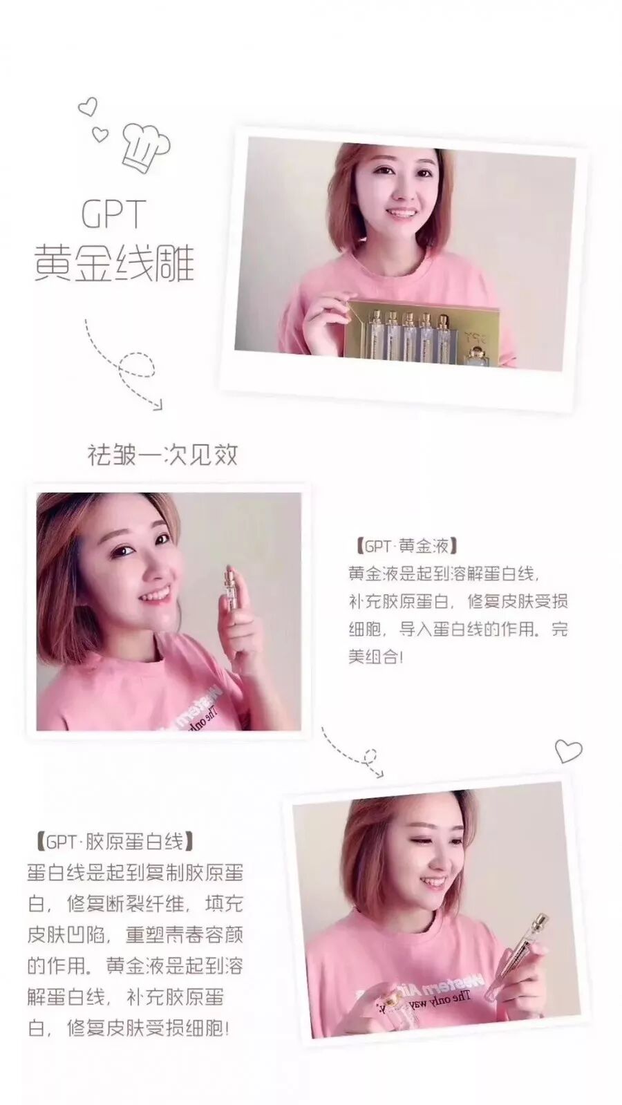 简单来说,GPT黄金线雕就是向皮下SMAS层埋入医用可吸收线,来实现面部提升的目的。非手术埋线技术,不开刀、不缝合,不吃药,不影响日常工作。胶原蛋白线,使肌肤真皮层可吸收线体,可完全分解,效果可达3--5年。除全面部提升外,祛皱,抗衰,紧致肌肤,重塑健康美肌