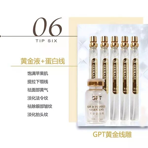 GPT黄金线雕是一款采用了全球顶尖科技抗衰老的成分,并且将这种成分和纳米黄金相融合,不仅可以促进肌肤再生、淡化斑点皱纹,还能够雕塑面部轮廓,让你重新拥有青春容颜。