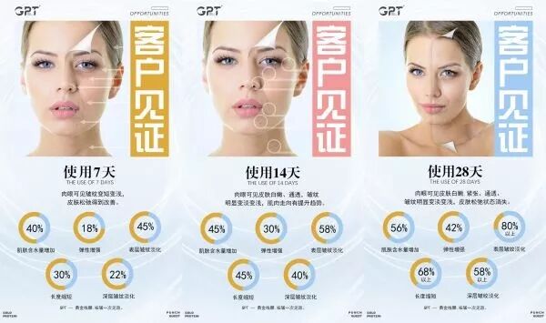 核心成分:GPT核心成分是来自全球最大的化工公司巴斯夫集团获得全球专利的分A00088,能有效保护肌肤成纤维母细胞生长因子FGF-2,促进细胞增殖,胶原蛋白和弹力蛋白再生,有效淡化皱纹,雕塑面部轮廓,改善肤质,标本兼治