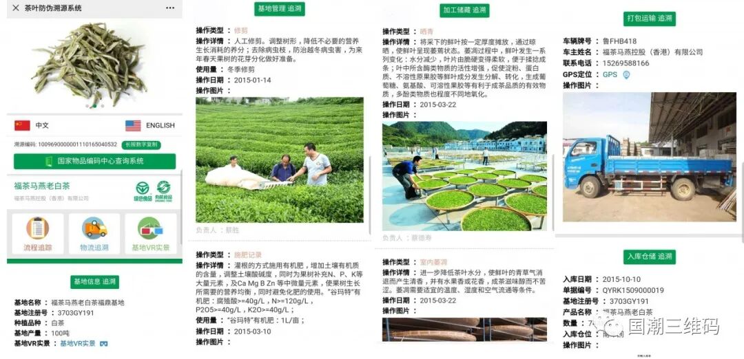 目前,三维码防伪溯源系统已经在以茶叶、蔬果、食用菌、畜禽四大类龙头企业及产品得到了很好的应用,以茶叶为例,三维码追踪体系很早就已经投入使用,溯源体系涵盖了茶叶生产销售的各大领域,如基地信息、基地管理、加工储藏、打包运输、入库仓储、销售出库、连锁网点等,消费者用手机扫描茶叶包装上的三维码标签,即可显示茶叶的整个流通过程和食品的安全信息,甚至可以查看茶叶生产基地的VR实景,提高消费者对企业品牌的信任度和认可度。