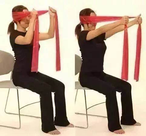 端坐在椅子上,双腿分开与髋同宽,将弹力带套在头部后侧,双手拉住弹力带两端,吸气延展脊柱,呼气双手拉弹力带与颈部形成抗组力量。