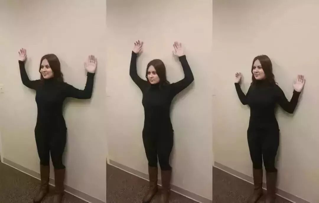 双腿打开呈肩宽,靠墙站立,延展脖子后侧,可以用食指辅助推下巴向后,头靠墙,保持整个背部与头部紧贴墙,保持5-8分钟,如果有空的话,也可以多保持一会儿。