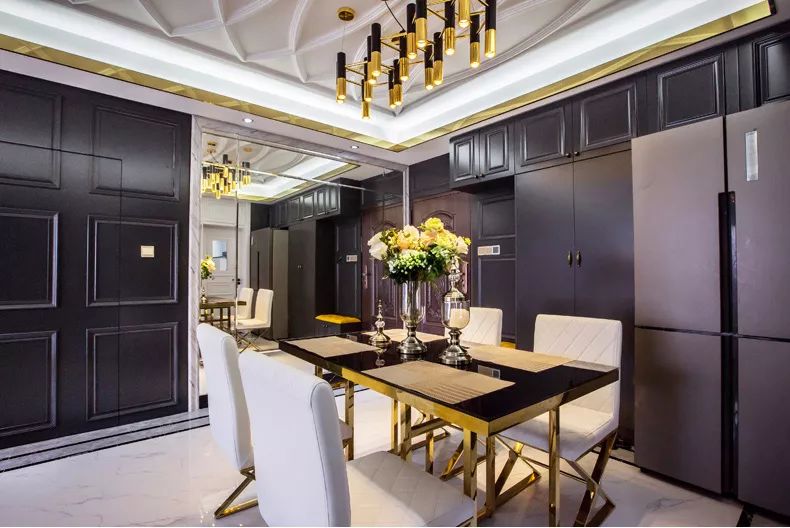 ▲餐厅顶上金属吊灯,金属框架的餐桌椅,营造出一个轻奢高档的空间质感。