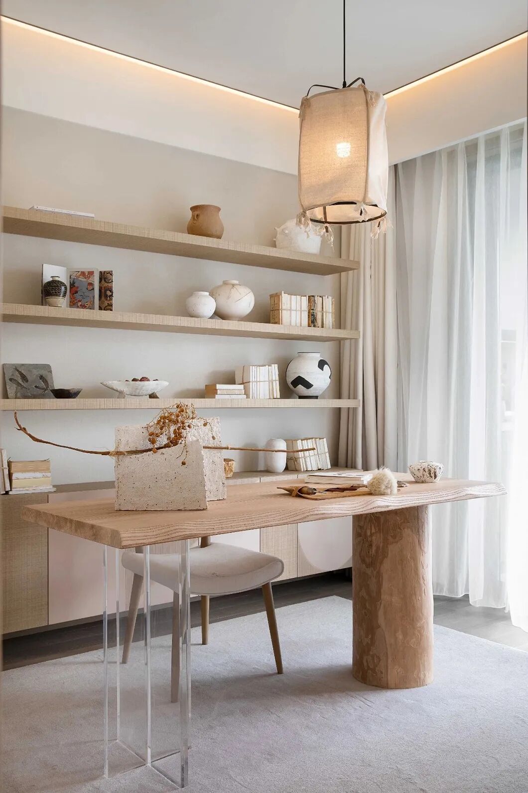 大量留白的空间让视觉放松下来,原木色的搁架与工作桌质朴无华,精挑细选的瓷器摆件充满了文人墨客的情调,在瞬间便将现代社会快节奏的烦扰褪去一二,在家中为自己觅得一方精神绿洲。