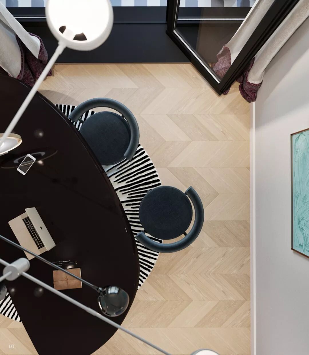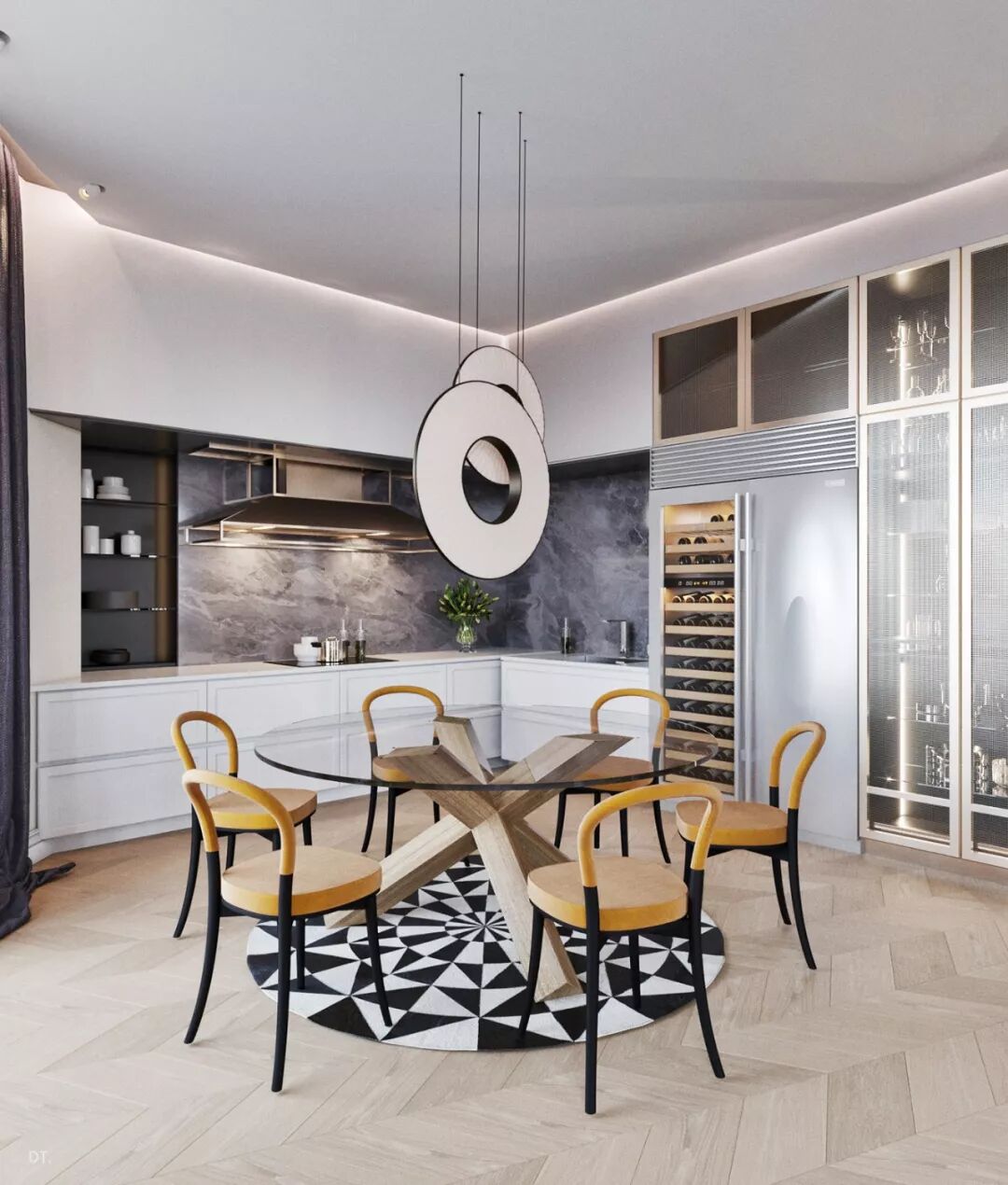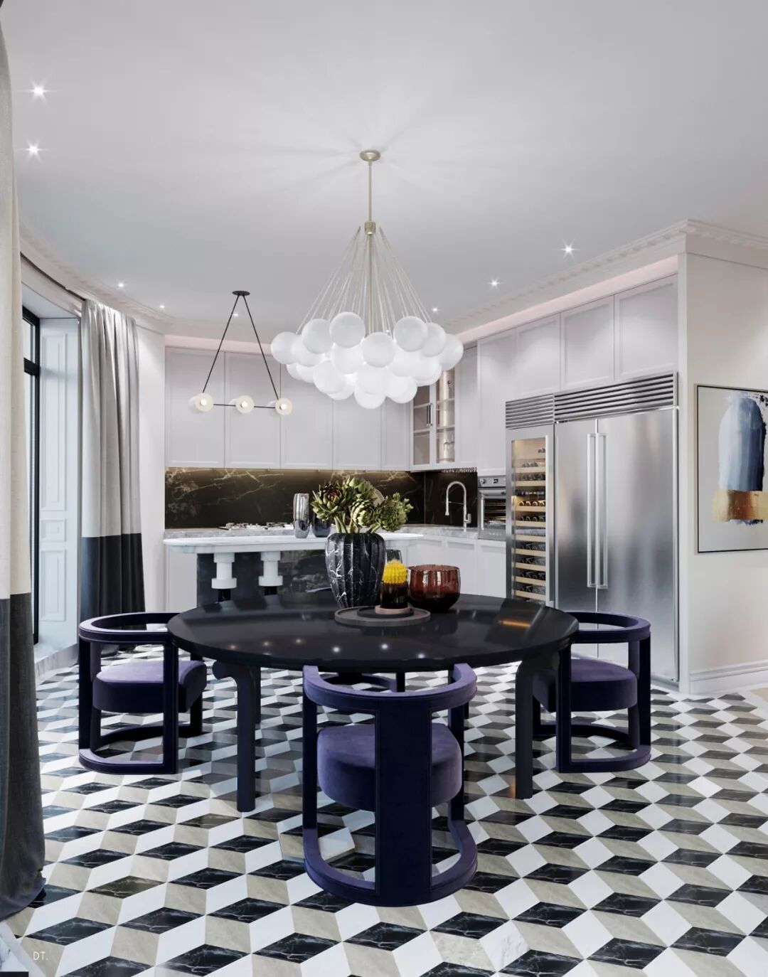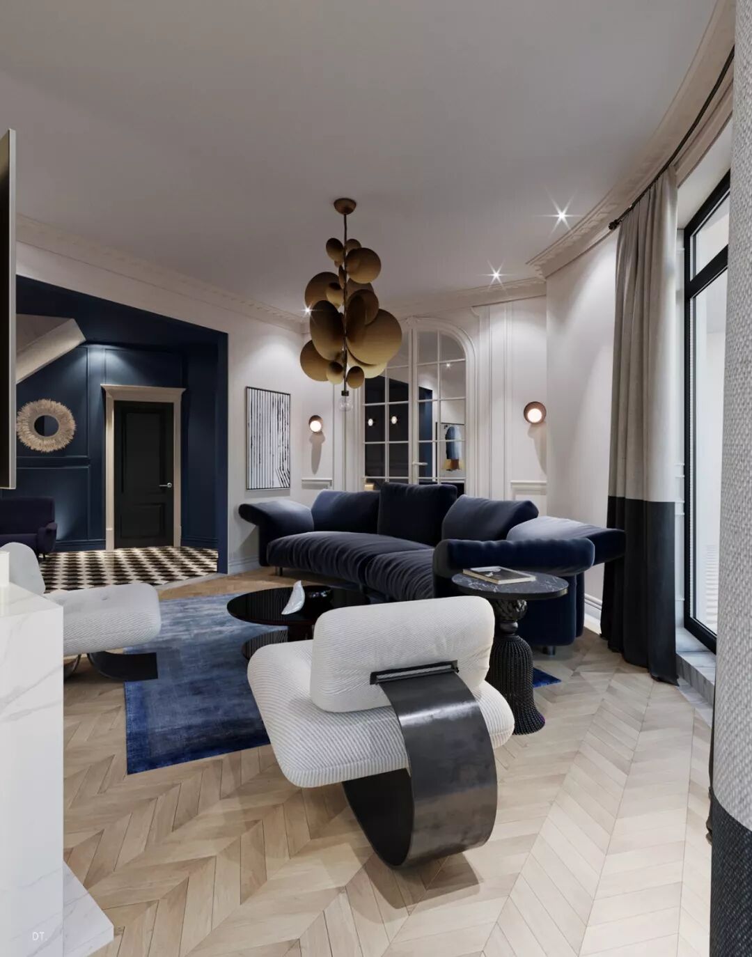 区别于第一个,第二个设计更复古,设计手法也更华丽,地面黑白几何地砖立体感强,使空间纵深感更强,藏蓝色木饰面深邃、雅致。