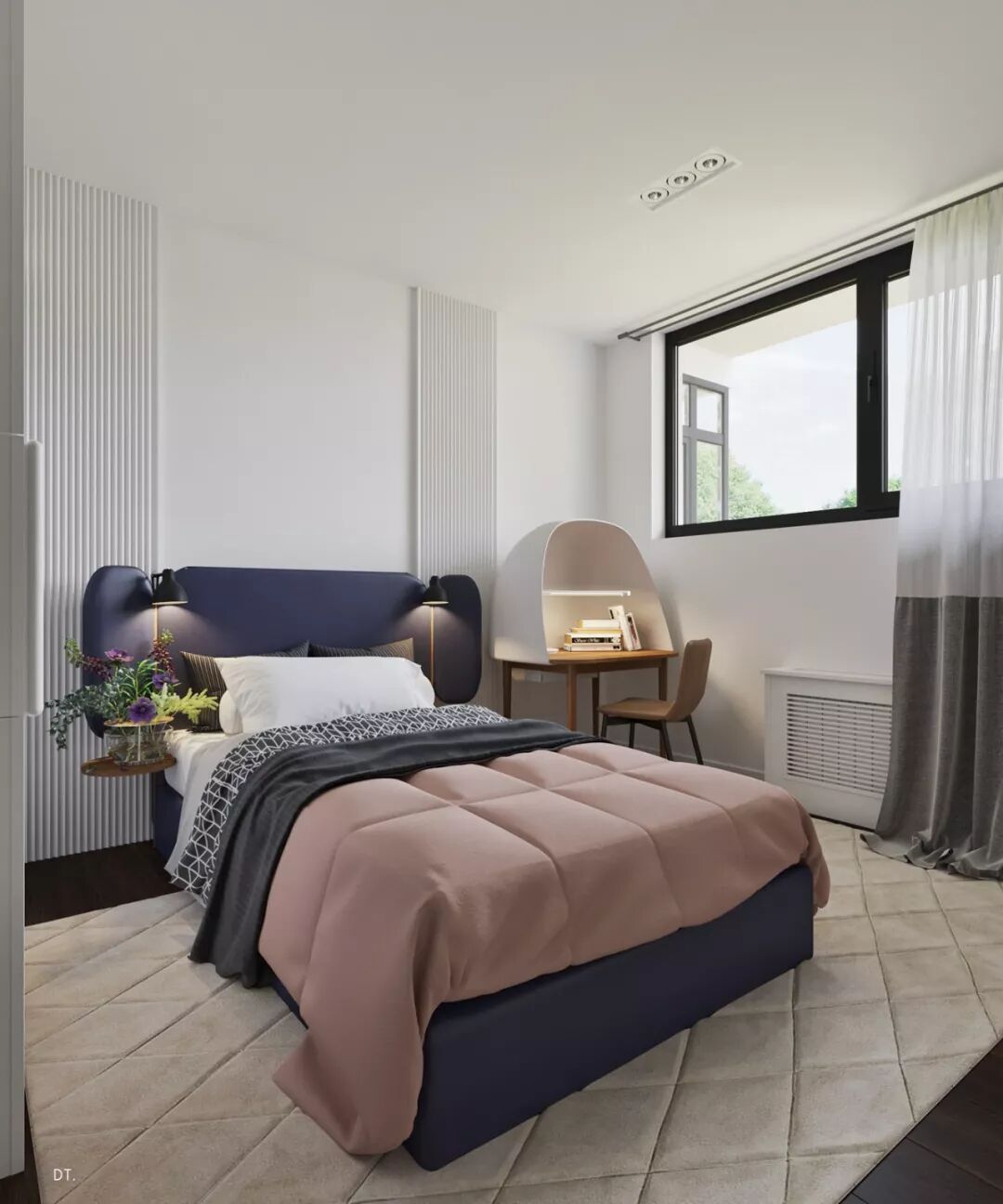 床头的背景墙用柔软绒质作装饰,绒面本身的纹理就比较带质感,这样也能装饰出轻奢感。