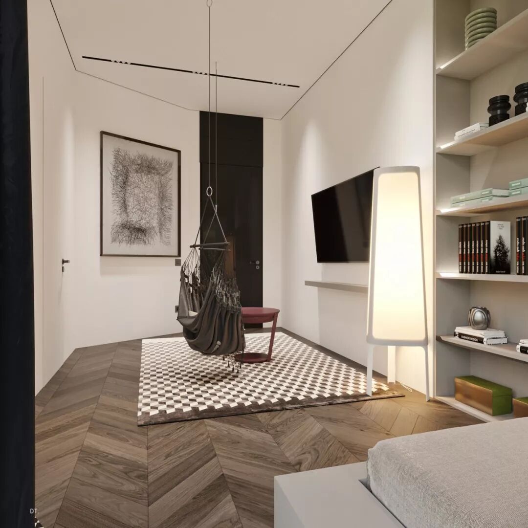 跳出思维方框,别出心裁的两张吊椅置于卧室中央,打造一个有趣而轻松的悠闲之地,给生活制造多一分惊喜。