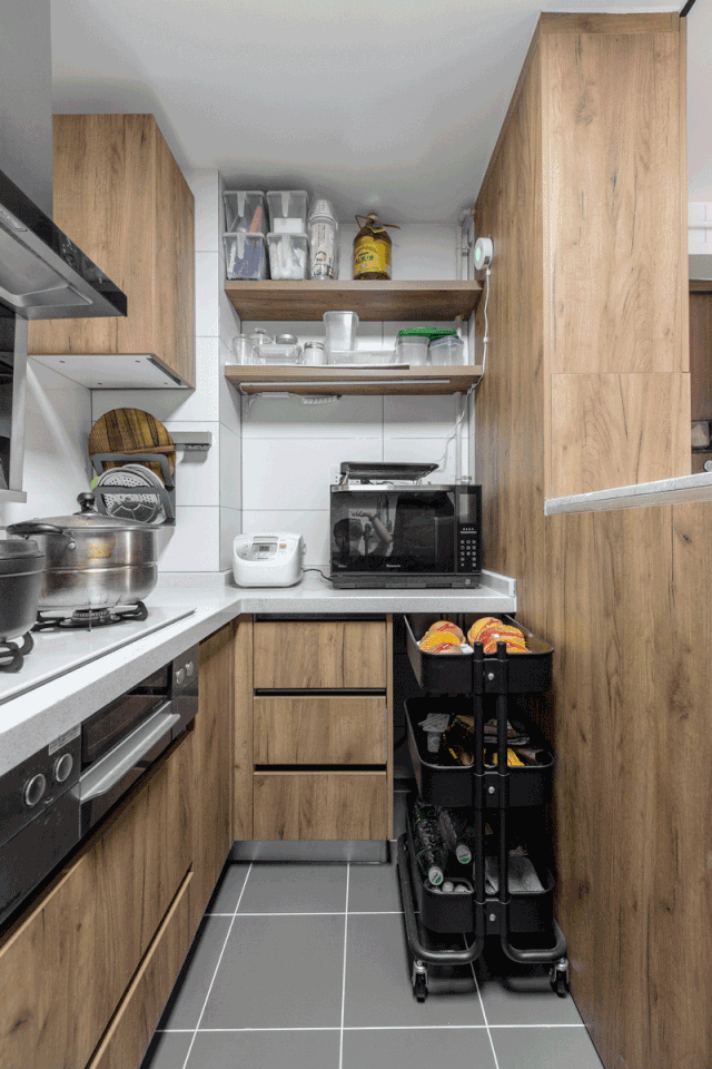 台面空间不够用的话,有些人可能会习惯移动收纳架来辅助做饭的操作,让做饭的动作更加流畅方便。