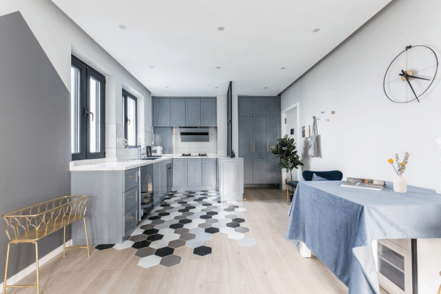 ▲玄关的定制鞋柜+玻璃屏风隔断,让进门后的开放式厨房保持一定的私密性,而地面的杂色六边砖搭配,也是让空间显得更加文艺舒适。