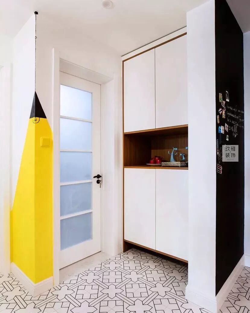 墙体改建后门厅部分出现了一个角,从风水角度来说,尖角不适合出现在家里(这没有什么大的影响,不在意风水可以忽略)。设计师亲手在尖角处画了一个灯,以此弱化角的存在感。
