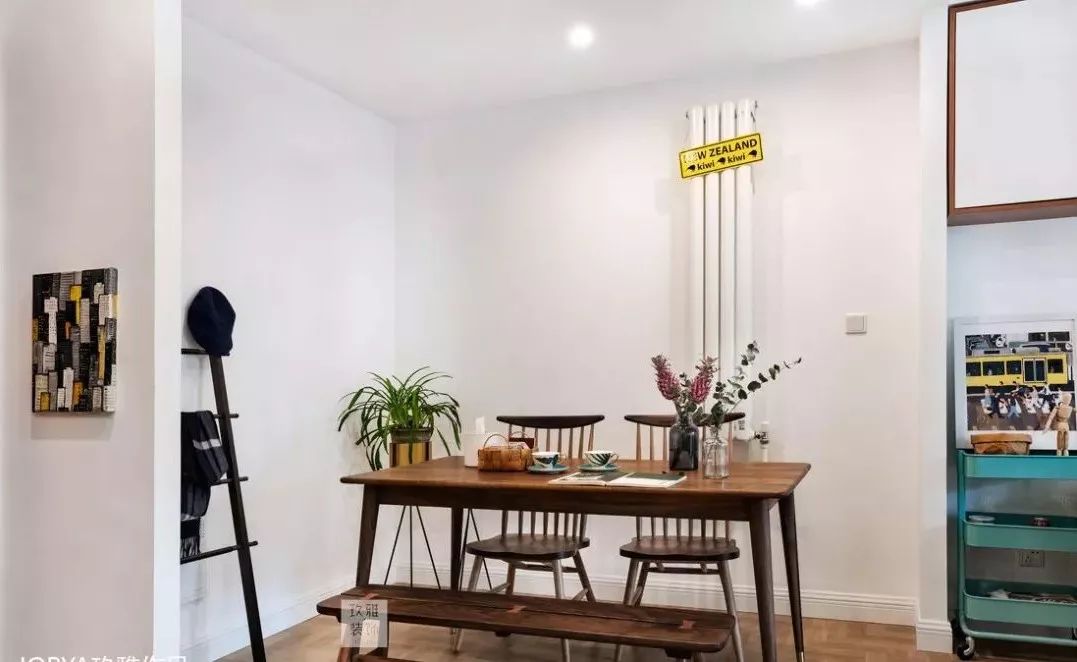 ▲餐桌一边是长凳,一边采用了温莎椅。顶部做了平面吊顶后选择筒灯作为照明,餐厅的设计非常简单。