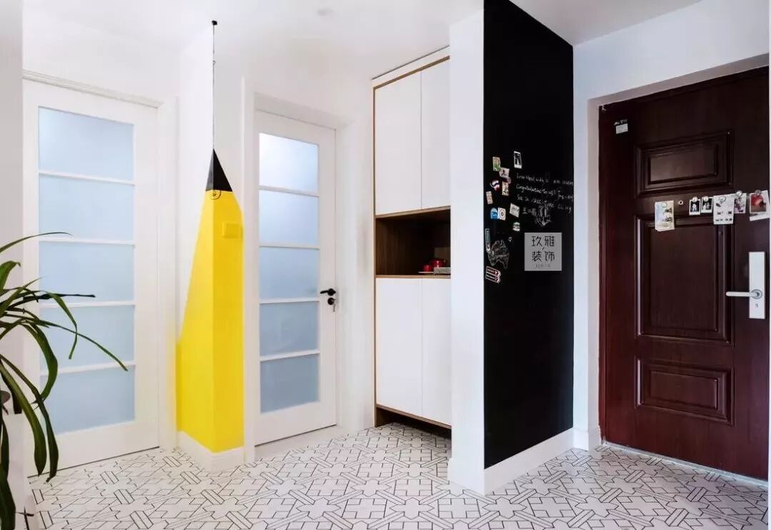 ▲进门右手边设计了一面黑板墙,满足了业主想要一块不太大的黑板墙的需求。