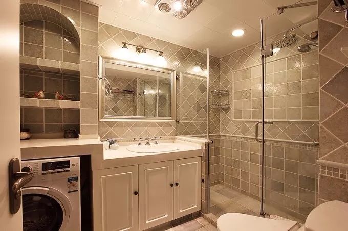卫生间里面放置洗衣机,可以结合洗手盆设计,把洗衣机藏到洗衣机里面,这样可以把洗衣机上方利用起来,成为洗手台的一部分。