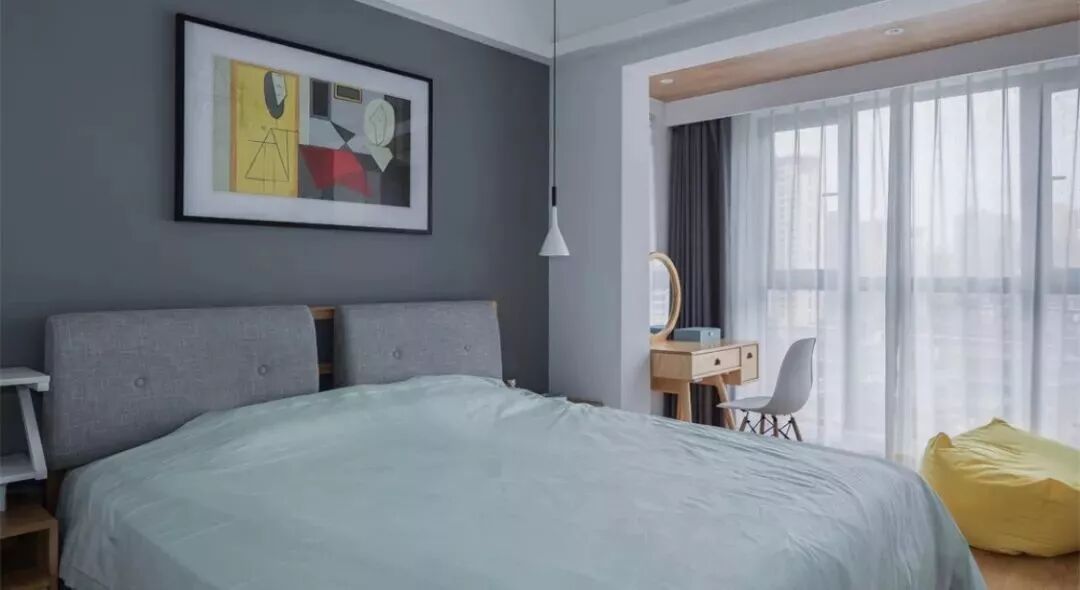 床头床尾腾空出来作他用,把女主人的梳妆台放到阳台一侧,化妆的时候更加明亮,心情都显得好漂亮。
