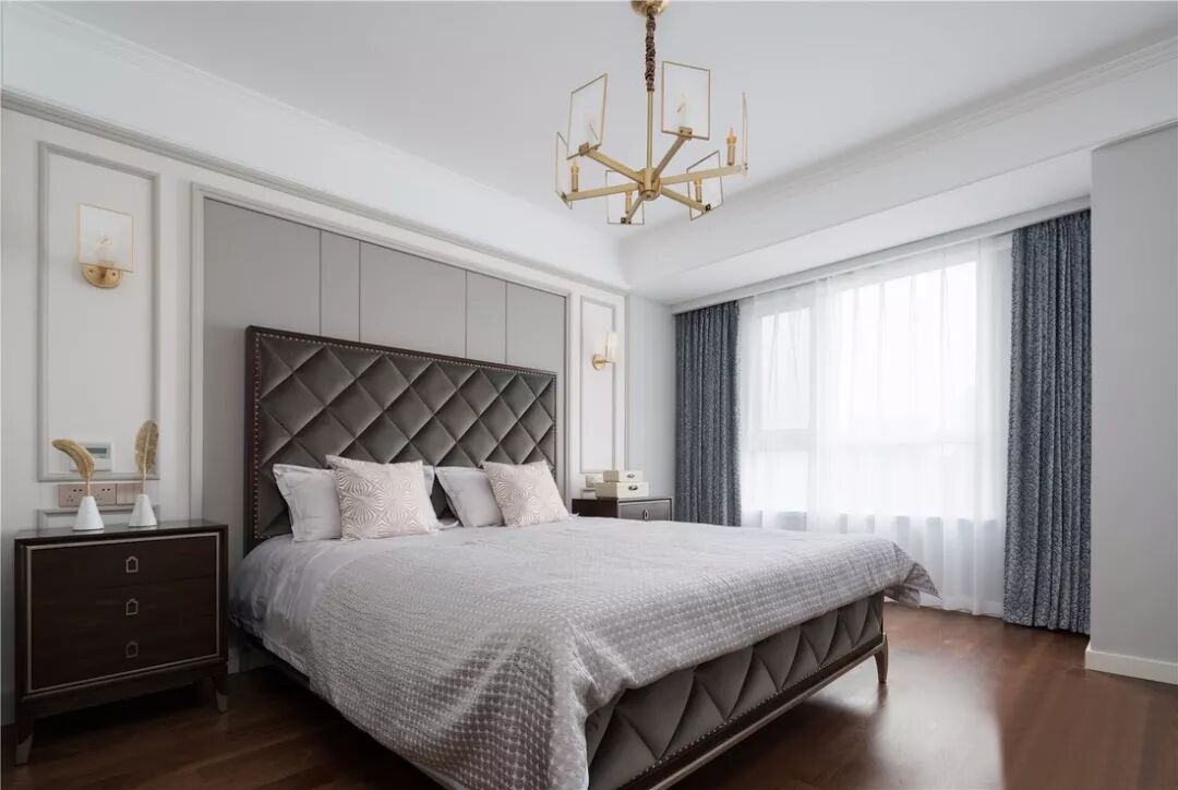 ▲ 高级灰的硬包与线条简洁大气,配以素雅的床品营造出安静舒适的氛围。